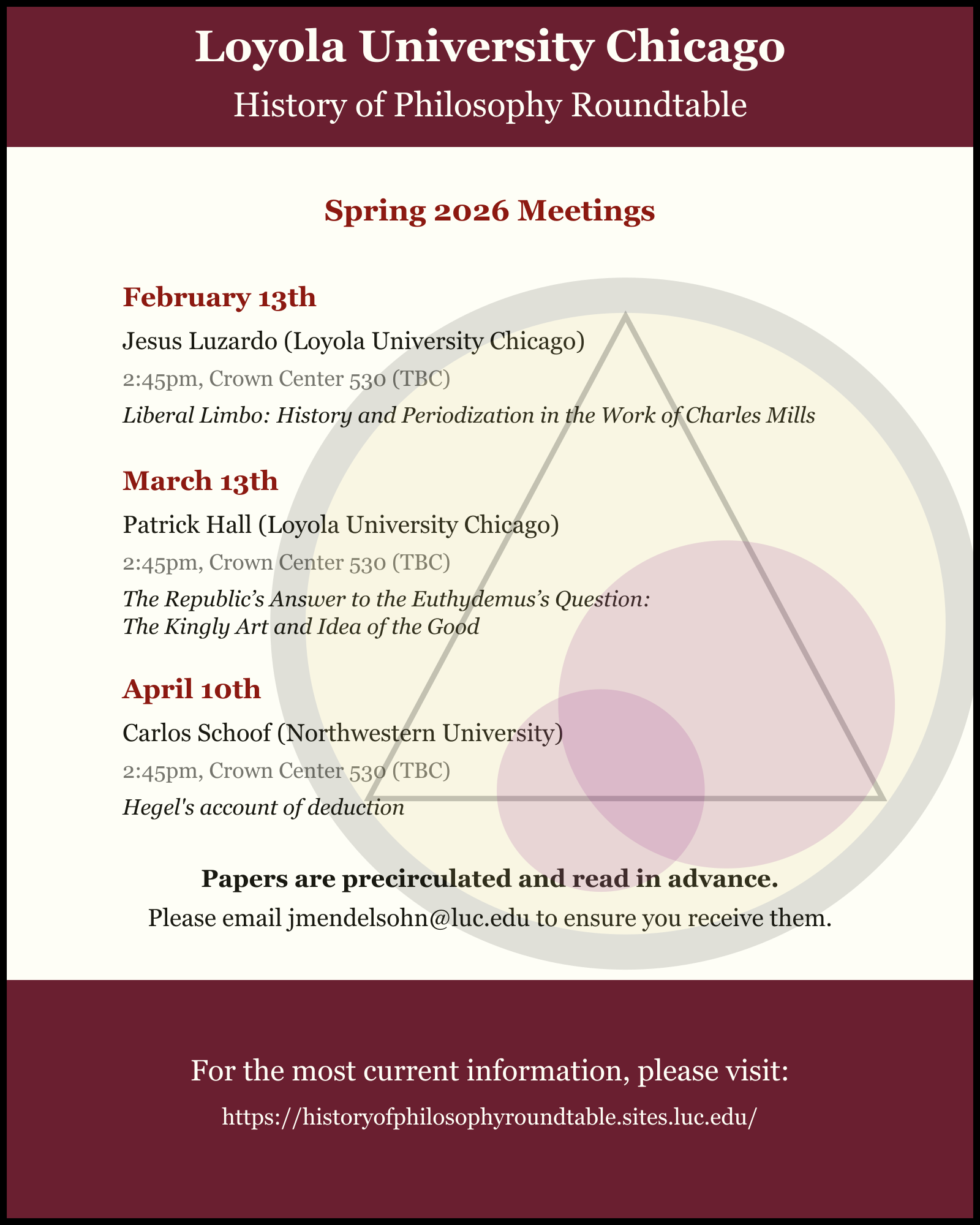 - 03/13/26 — Patrick Hall (Loyola University Chicago), "The Republic’s Answer to the Euthydemus’s Question: The Kingly Art and Idea of the Good"
